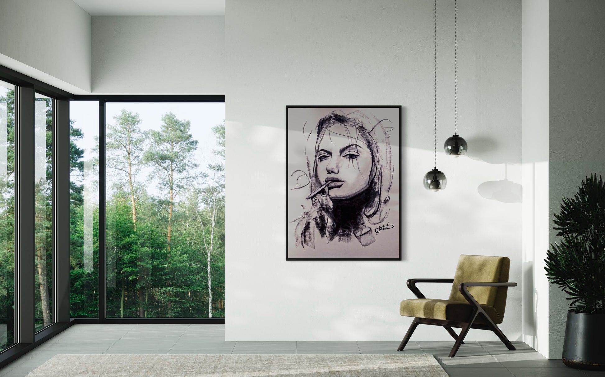 This charcoal portrait of Angelina Jolie uses a free, bold style and expressive lines to render her beauty and strength. The confident strokes create a dynamic drawing with palpable energy to make a dramatic piece.