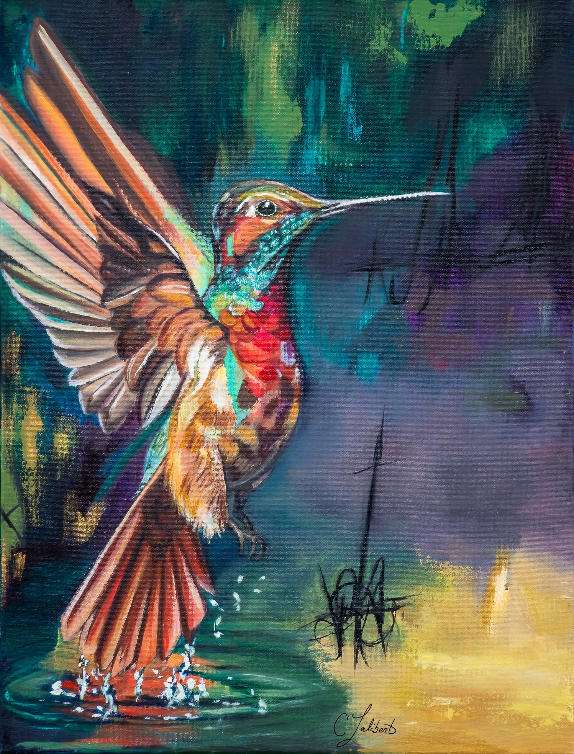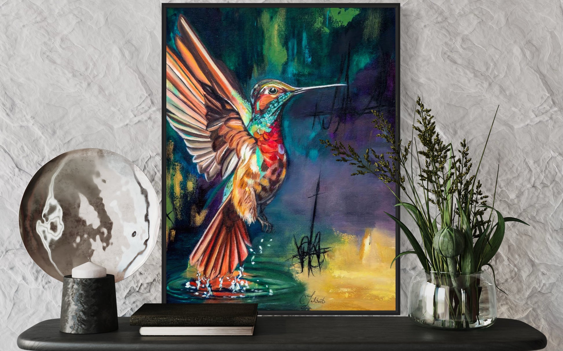 The radiant color and light of this hummingbird amidst darker shadows emphasizes the ability to find brightness even in challenging circumstances. Illuminate your walls with this beautifully captured moment.