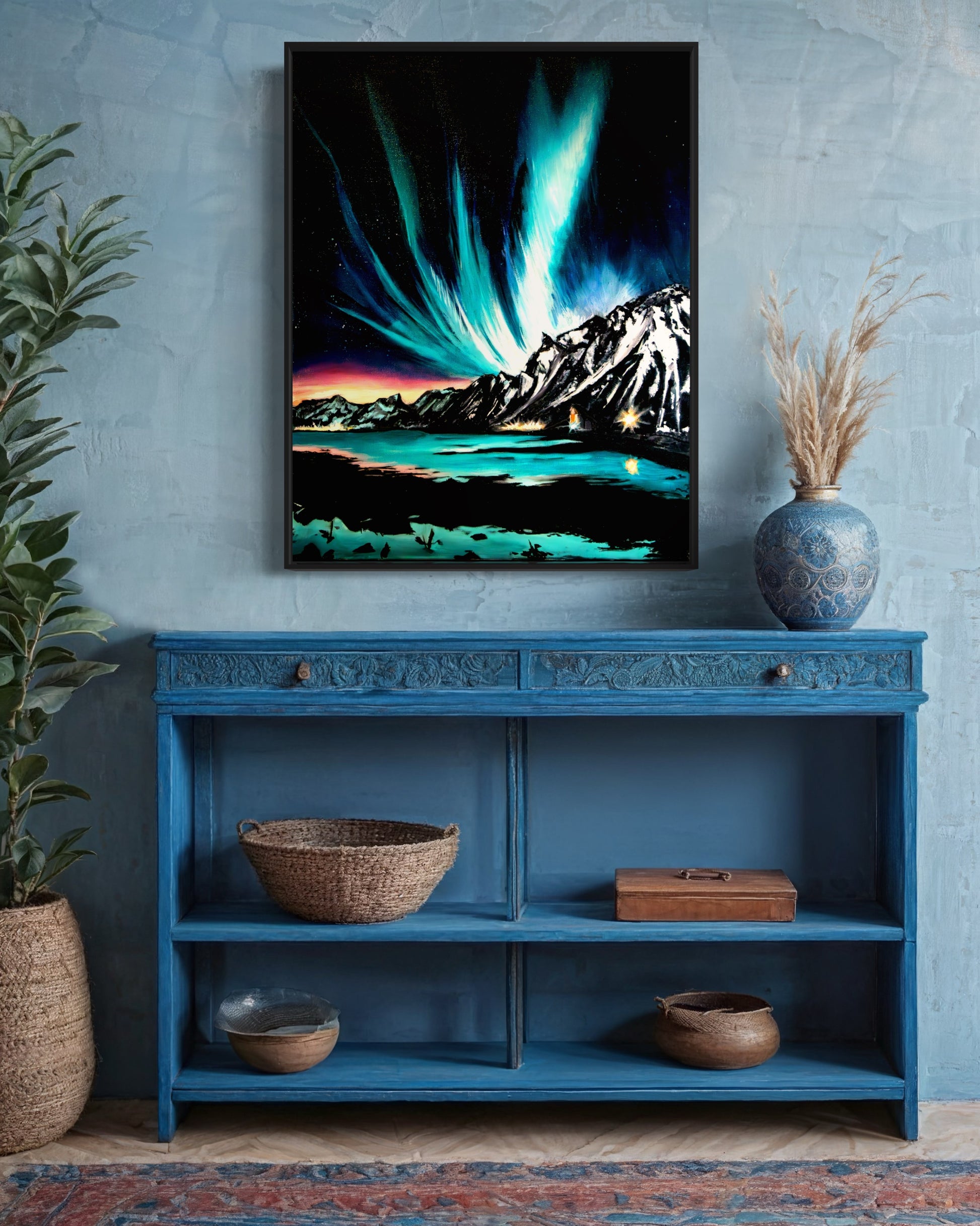 'Aurora' is a captivating painting inspired by the Northern Lights. Its stunning yet serene scene showcases the beautiful Aurora Borealis, making it a perfect addition to any space. Bring the wonder of nature into your home.