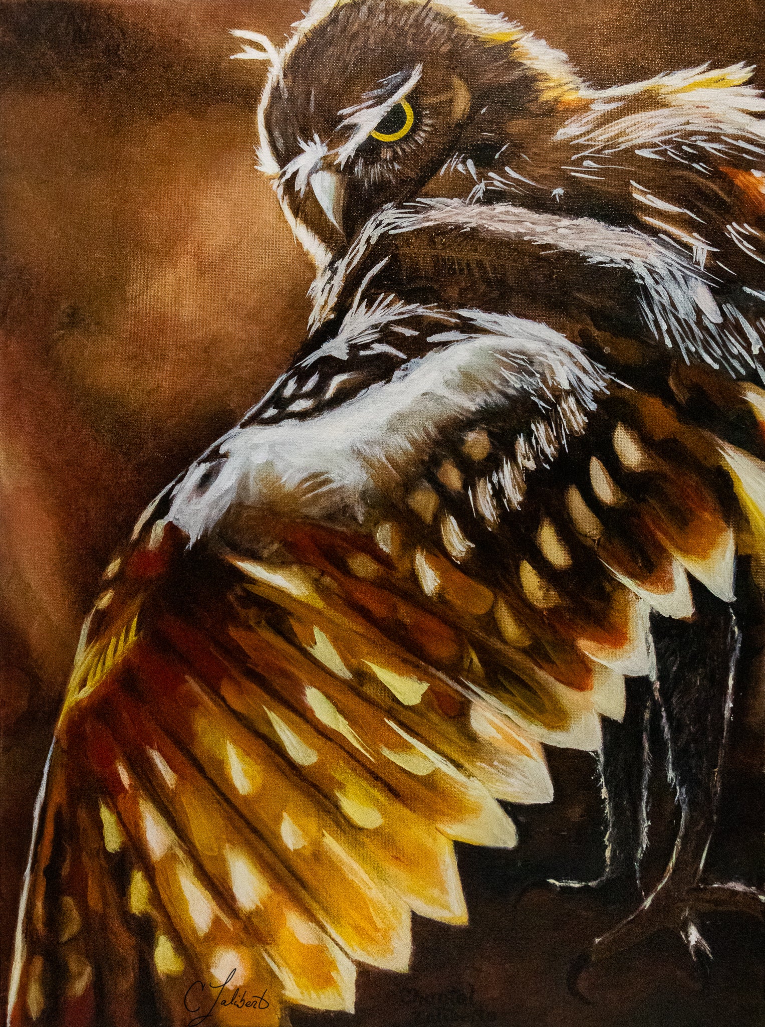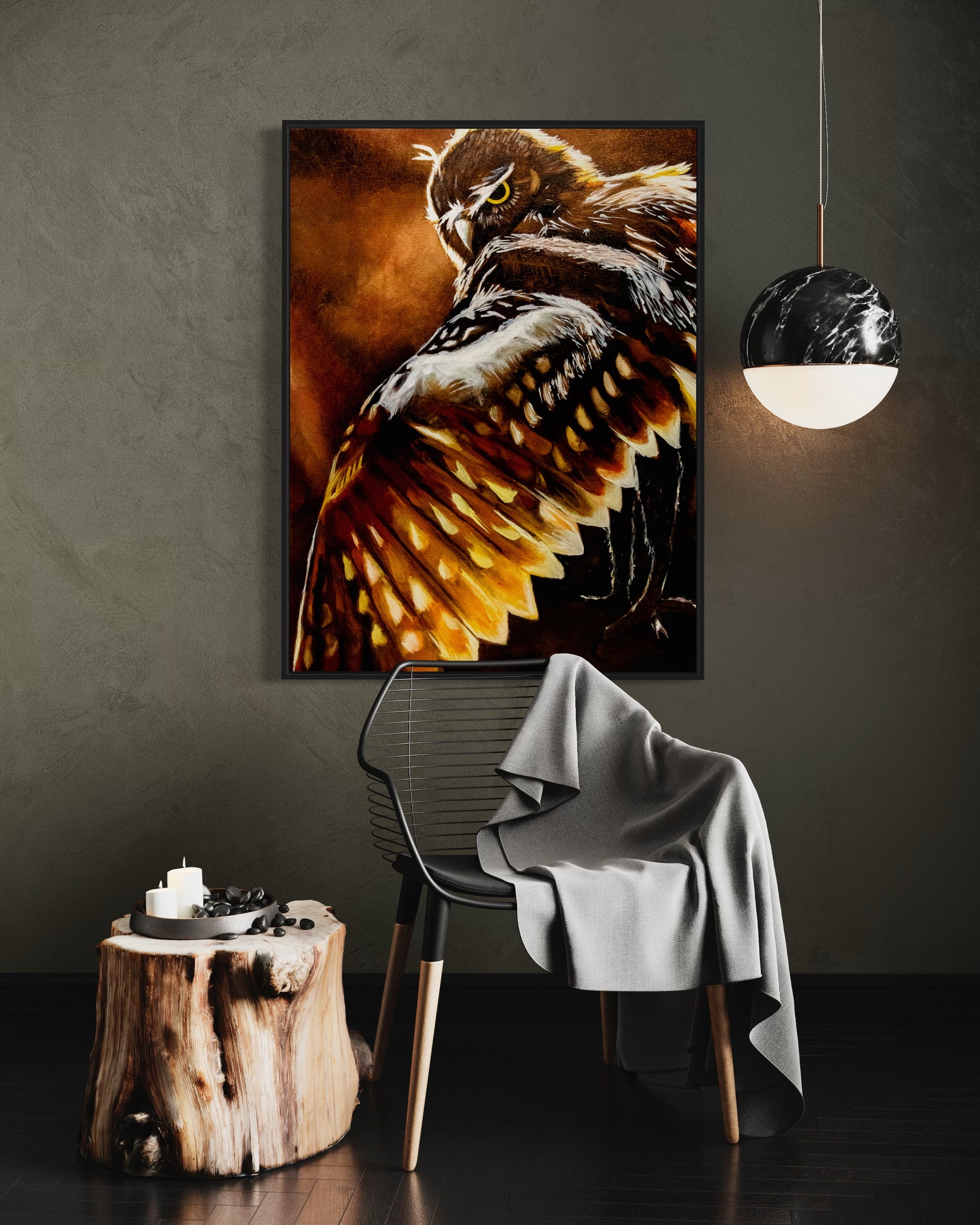 - A powerful painting depicting a watchful owl keeping vigilance during the transition from day to night. The warm, glowing hues invite a connection to this wise guardian, despite his piercing gaze.